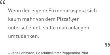 Unsere Stärke ist, dass wir je nach Projekt individuelle Spezialistenteams zusammenstellen um das optimale Ergebnis zu erreichen. Was ist das Besondere an Peppermint Print und worin unterscheiden wir uns zu einer herkömmlichen Druckerei? Unser Know-How liegt in über 30 Jahren Erfahrung im Drucksektor. Wir kennen alle Anbieter, alle Anwendungsfälle und viele Lösungen. Dabei suchen wir den engen Kontakt mit dem Kunden und überzeugen durch Leistung, Wissen und Ehrlichkeit. Unser Prinzip: Nicht alles selbst machen wollen, sondern für Spezialfälle geeignete Partner einbinden. Dabei übernehmen wir als Gesamtauftragnehmer die Steuerung von Qualität und Beratung. Wird der Druckmarkt nicht nur noch von Internetpreisen bestimmt? Stimmt, zumindest was die Preise bei Kleinauflagen mit geringem Qualitätsanspruch betrifft. Um so wichtiger für uns und unsere Partner sich weiter zu spezialisieren und Möglichkeiten aufzeigen sich in Qualität, Idee, Material, Format und Veredlung klar zu unterscheiden.